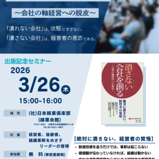 お知らせ 出版記念セミナー ●日時 2026年3月26日(木) 15:00-16:00●対象 経営者、経営幹部、後継者、中小企業の支援者●講師 100年企業創り株式会社 経営コンサルタント 小野知己 日髙安則●場所 (社)日本綿業倶楽部(綿業会館) 541-0051 大阪市中央区備後町2-5-8●参加費 無料●お申込み 下記のリンクからお申し込みください 『潰さない会社を創る ~会社の軸経営への脱皮~』 出版セミナー申込書 – フォームに記入する お知らせセミナー